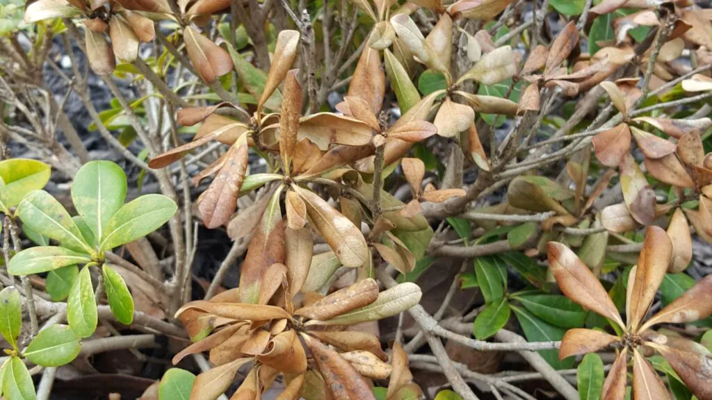 We are seeing, and clients have been reporting, cold damage to a number of plants. The cold snap that we had November 12-14, 2019 is probably the main culprit. The damage could also have been worsened by the cold snaps we had in December (18th & 19th) and even in January (20th – 22nd).The damage done to the plants shows as something that looks like the leaves and/or branches have been “burnt” due to the desiccation that is showing up over the last month or so.